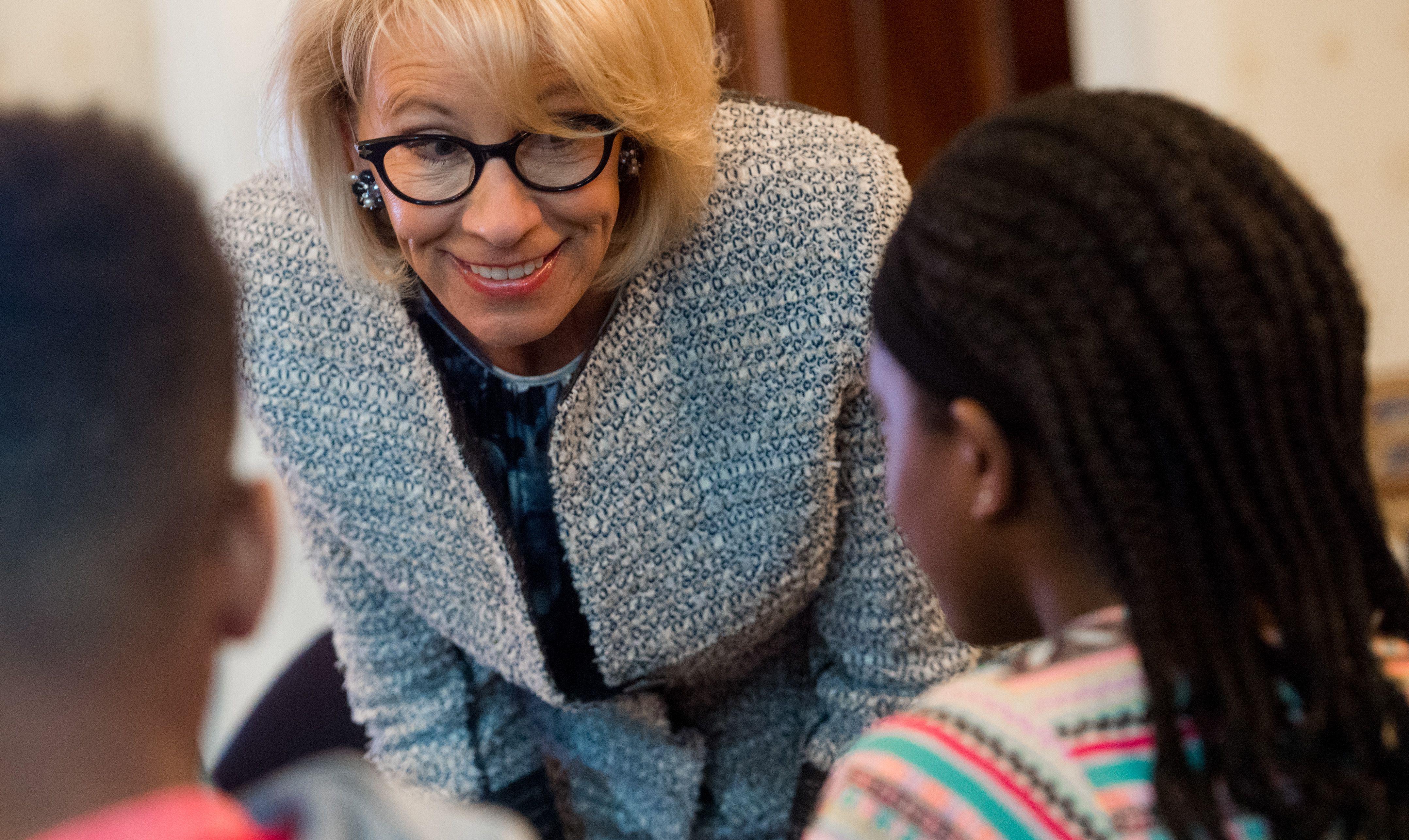 Secretary of Education Betsy DeVos speaks with middle school students in Washington, DC, April 9, 2018.
