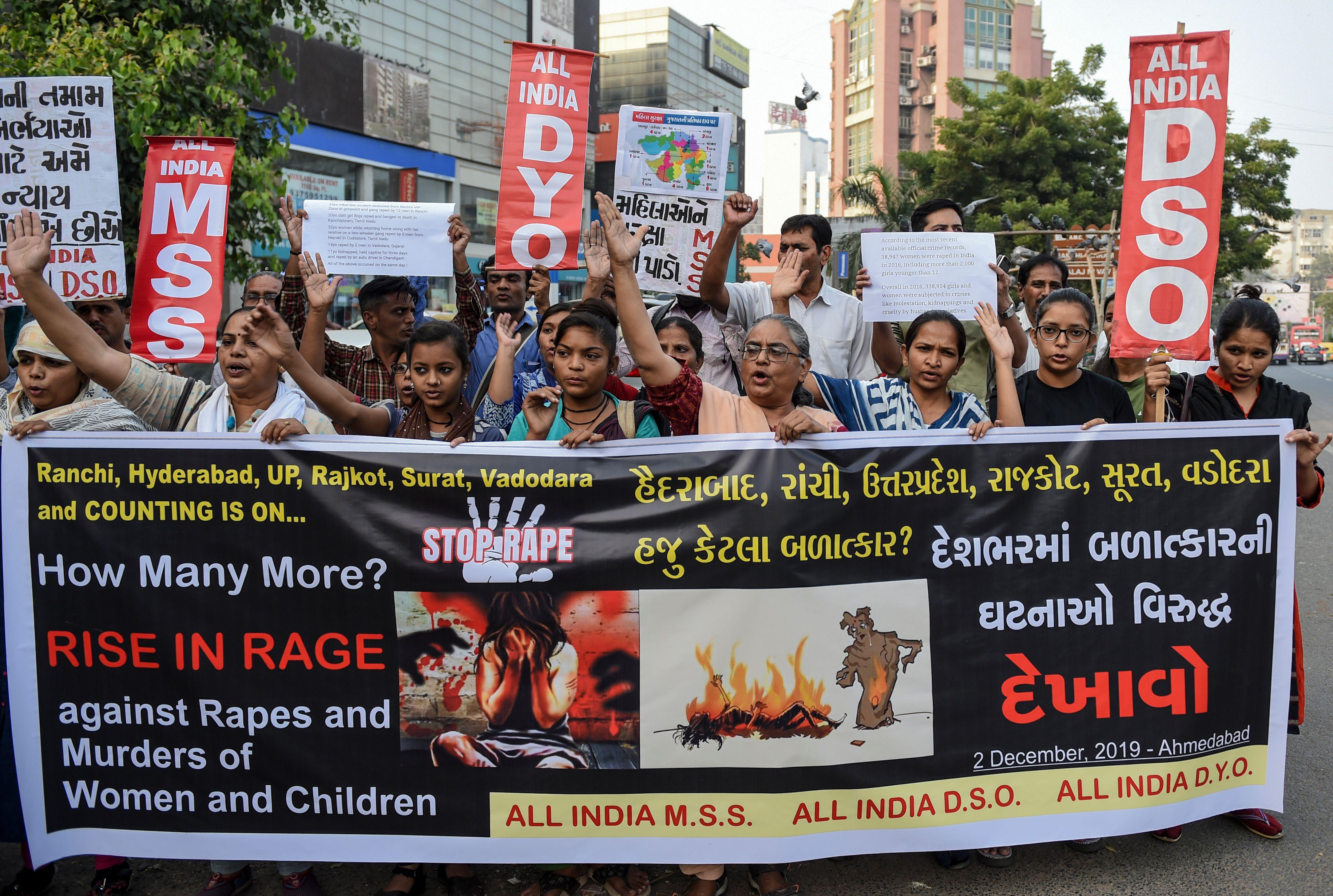 Demonstrators protest against recent string of high-profile rapes after the alleged rape and murder of a 27-year-old vet in Hyderabad.
