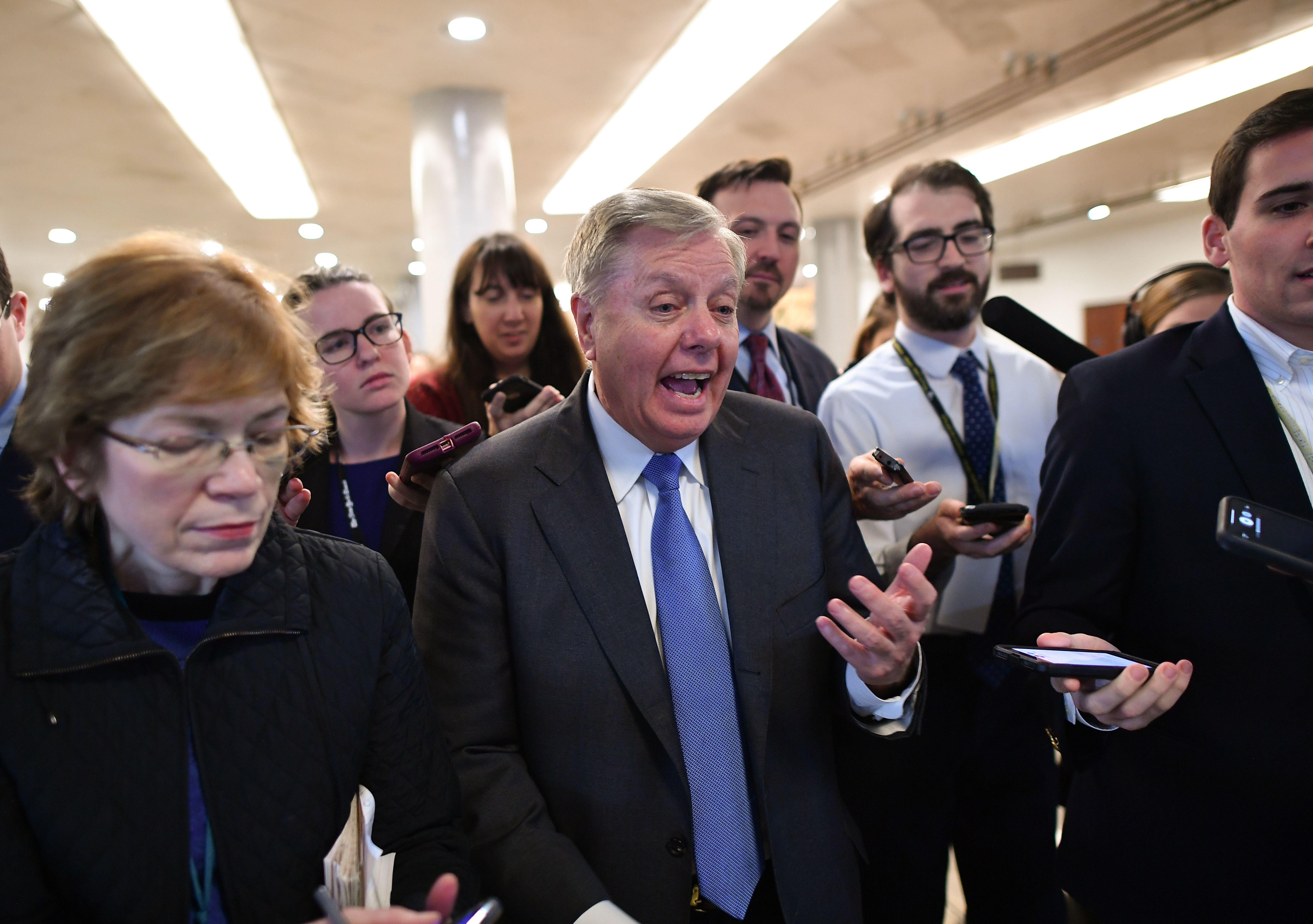 Sen. Lindsey Graham speaks to the media as he leaves after voting in the impeachment trial of the president on Capitol Hill January 31, 2020, in Washington, DC.